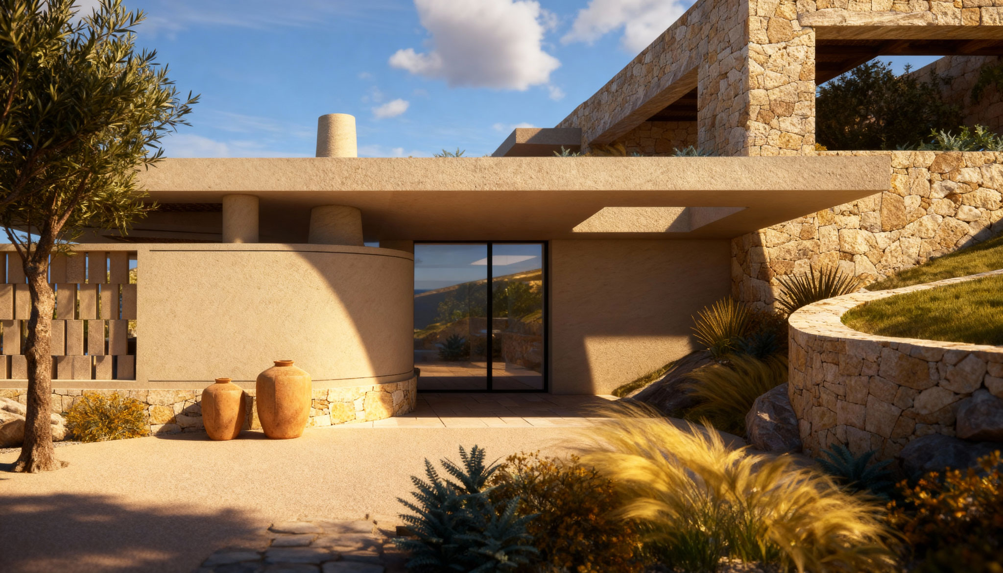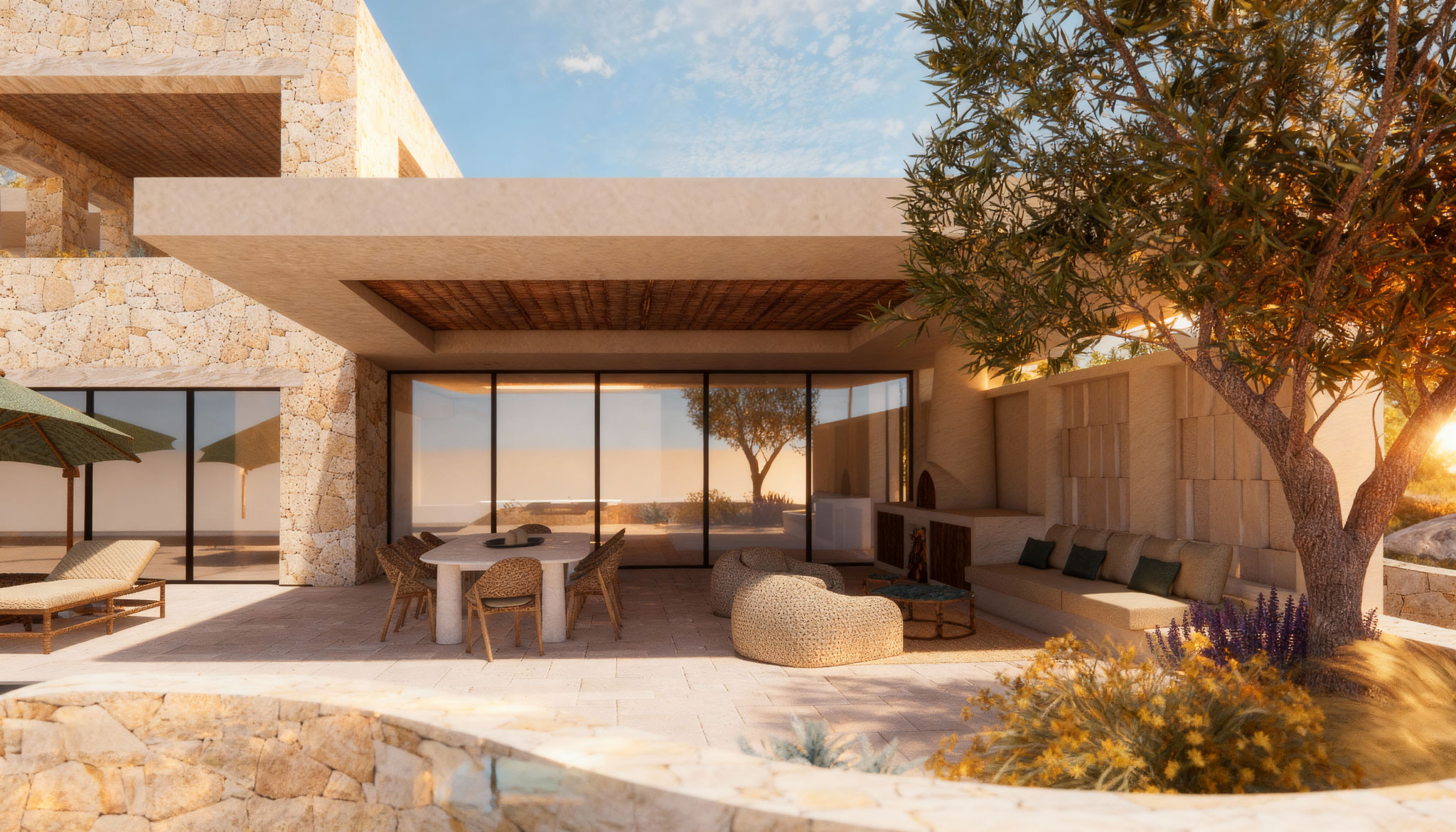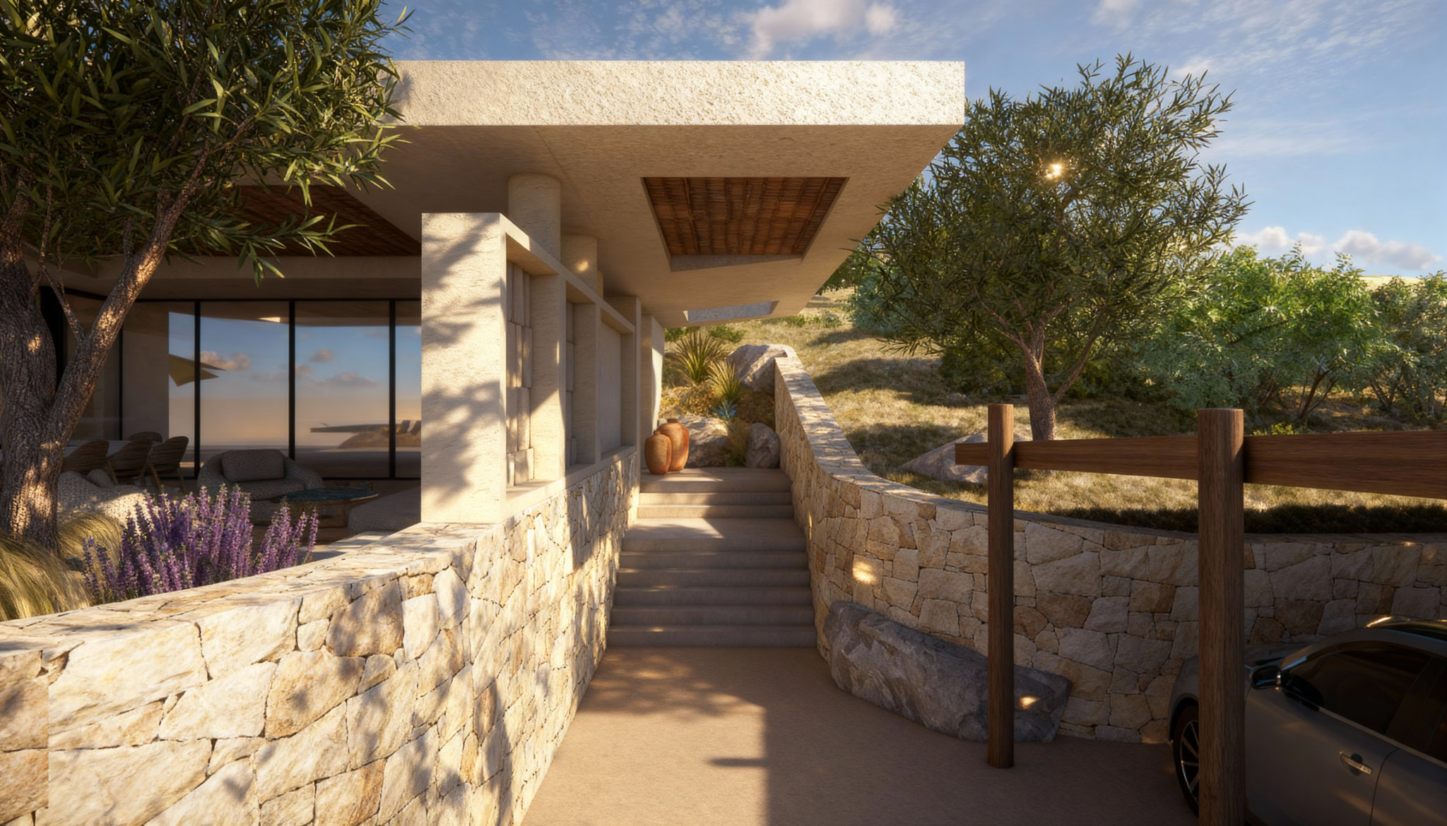 The expansive outdoor spaces are organized around natural focal points identified on the site, like boulders and olive trees, which are highlighted by curved stone retaining walls seamlessly blended into the natural contours.