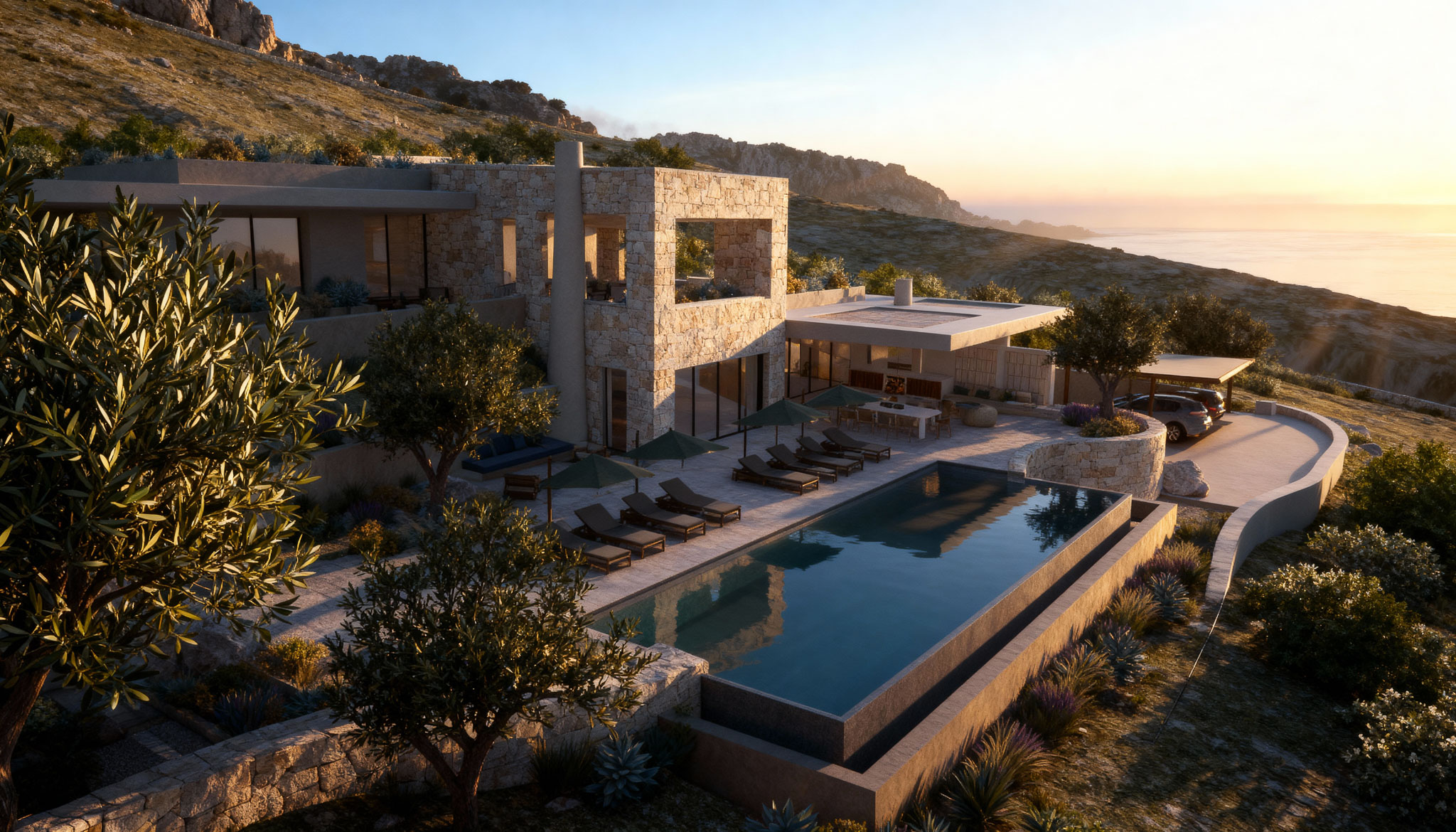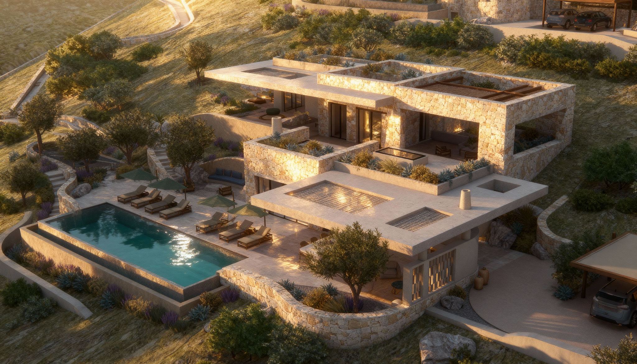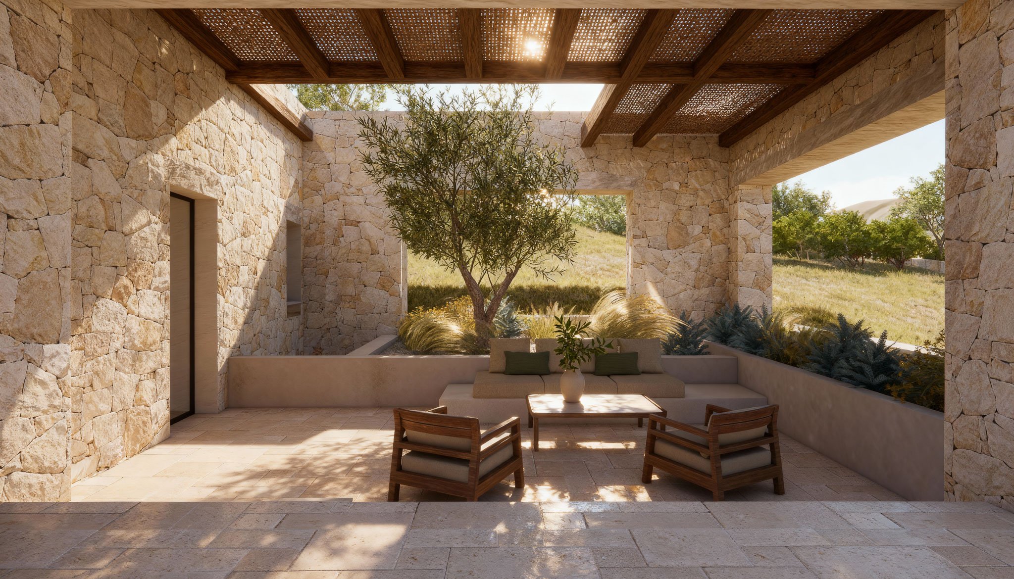 The expansive outdoor spaces are organized around natural focal points identified on the site, like boulders and olive trees, which are highlighted by curved stone retaining walls seamlessly blended into the natural contours.
